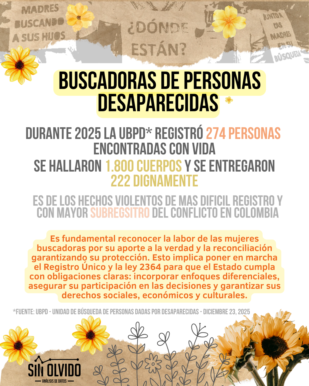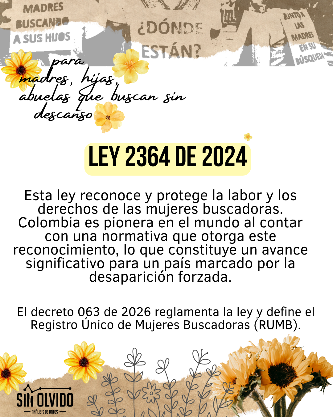 En reconocimiento a esta realidad, el Estado colombiano dio un paso histórico con la expedición de la Ley 2364 de 2024, reglamentada por el Decreto 0063 del 26 de enero de 2026. Esta normativa no es un simple conjunto de buenas intenciones; es un marco jurídico que reivindica a las mujeres buscadoras como «constructoras de paz y sujetos de especial protección constitucional» (Artículo 1, Ley 2364).La ley se fundamenta en principios clave como la dignidad, la integralidad, la acción sin daño, la corresponsabilidad y la participación. Esto implica que el Estado no puede seguir actuando de manera fragmentada; debe garantizar una respuesta holística que abarque desde la atención psicosocial hasta la reparación económica. Uno de los mecanismos centrales es la creación del Registro Único de Mujeres Buscadoras (RUMB) , a cargo de la Unidad para las Víctimas. Este registro permitirá: – Acreditar oficialmente la condición de mujer buscadora (sin necesidad de tener un vínculo sanguíneo con la persona desaparecida).- Caracterizar a las mujeres en sus diversidades (étnica, etaria, de género, discapacidad).- Facilitar el acceso a las medidas estatales de salud, vivienda, educación y protección. El Decreto 0063 detalla minuciosamente el procedimiento de acreditación, que será gratuito, voluntario y podrá realizarse ante la Defensoría del Pueblo, las personerías o consulados, garantizando el principio de buena fe. El artículo 18 de la ley adiciona una circunstancia de mayor punibilidad al Código Penal (Ley 599 de 2000) para quienes ataquen, obstaculicen o represalien la labor de las mujeres buscadoras. Además, el Decreto 0063 ordena planes de sensibilización obligatorios para servidores públicos y la activación de rutas urgentes de atención en casos de violencia basada en género. Según el informe de la UBPD de diciembre de 2025: – 274 personas fueron encontradas con vida durante 2025. – 1.800 cuerpos fueron hallados en diferentes fosas y territorios.- 222 cuerpos fueron entregados dignamente a sus familias. Cada uno de estos hallazgos representa años, a veces décadas, de búsqueda incansable. Sin embargo, el dato más crudo es el que se refiere a la frecuencia: en promedio, cada 36 horas desaparece una persona en Colombia, según el Comité Internacional de la Cruz Roja (CICR, 2024). Esto demuestra que el delito no cesa y que la lucha de las mujeres buscadoras es, lamentablemente, una carrera contra un reloj que nunca se detiene. La Ley 2364 de 2024 y su decreto reglamentario constituyen un avance paradigmático en América Latina. Por primera vez, un país reconoce de manera explícita que la búsqueda de desaparecidos no es un asunto privado o familiar, sino un deber del Estado y una contribución esencial a la paz y la verdad. Las mujeres buscadoras dejan de ser vistas como víctimas pasivas para ser reivindicadas como sujetas políticas, con derechos plenos y con un lugar en la mesa de negociación y construcción de paz. En conclusión, las mujeres buscadoras son la memoria viva de Colombia. Su lucha ha forzado al Estado a reconocer sus fallas y a construir, lentamente, un camino hacia la reparación. Este artículo es un homenaje a su resistencia y una constatación de que, mientras haya una madre buscando a su hijo o una abuela a su nieto, la exigencia de verdad no cesará. El Estado colombiano, finalmente, tiene las herramientas jurídicas para proteger esta labor. El tiempo dirá si las hace funcionar.