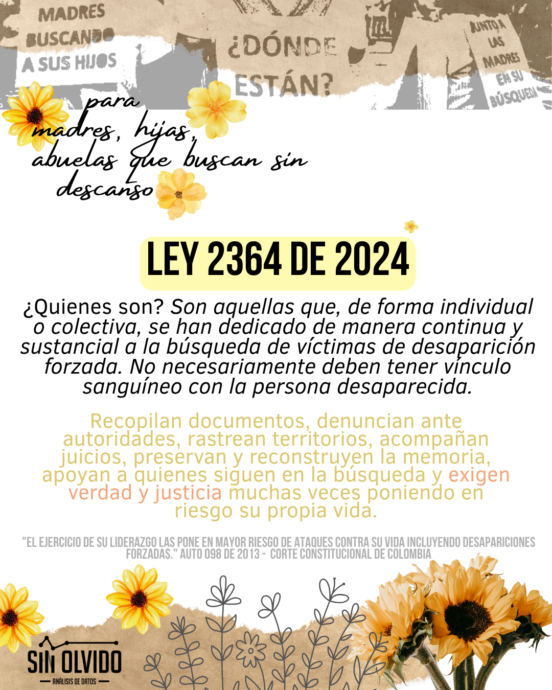 Ser mujer buscadora en Colombia no solo implica enfrentar el dolor de la ausencia de un ser querido, sino que conlleva riesgos adicionales que convierten su labor en un acto de valentía extrema. La Corte Constitucional, a través del Auto 098 de 2013, reconoció que «el ejercicio de su liderazgo las pone en mayor riesgo de ataques contra su vida, incluyendo desapariciones forzadas». Es decir, por el hecho de buscar, son blanco de estigmatización, amenazas, hostigamientos y violencia sexual.