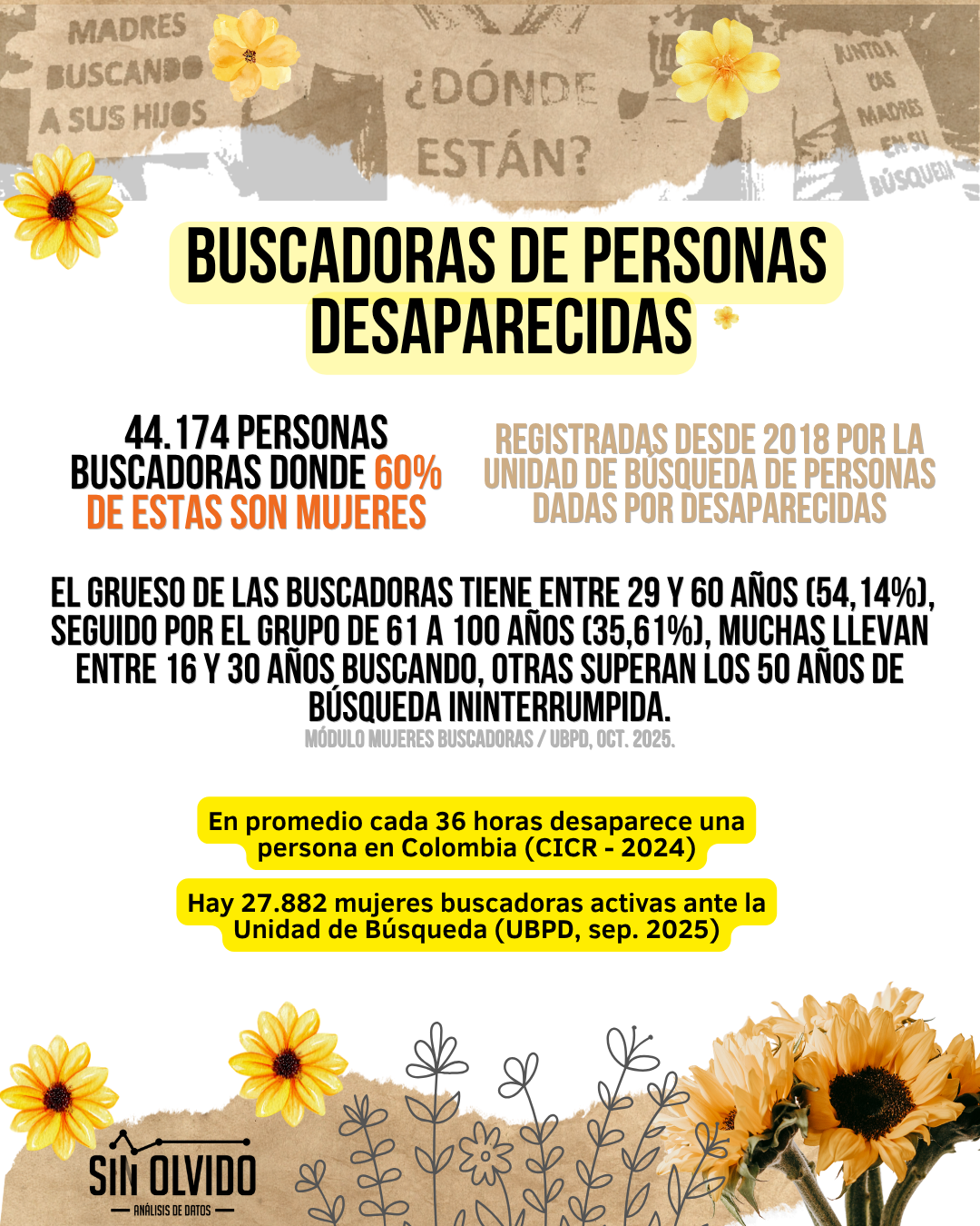 El presente artículo busca consolidar y analizar la información disponible sobre la magnitud de la desaparición forzada y el rol de las mujeres buscadoras en Colombia, integrando datos de la Unidad de Búsqueda de Personas dadas por Desaparecidas (UBPD) y del proyecto conjunto de la JEP-CEV-HRDG. Asimismo, se examina el hito normativo de la Ley 2364 de 2024 y su decreto reglamentario, como un reconocimiento estatal fundamental, aunque todavía insuficiente, a su labor y sus derechos.