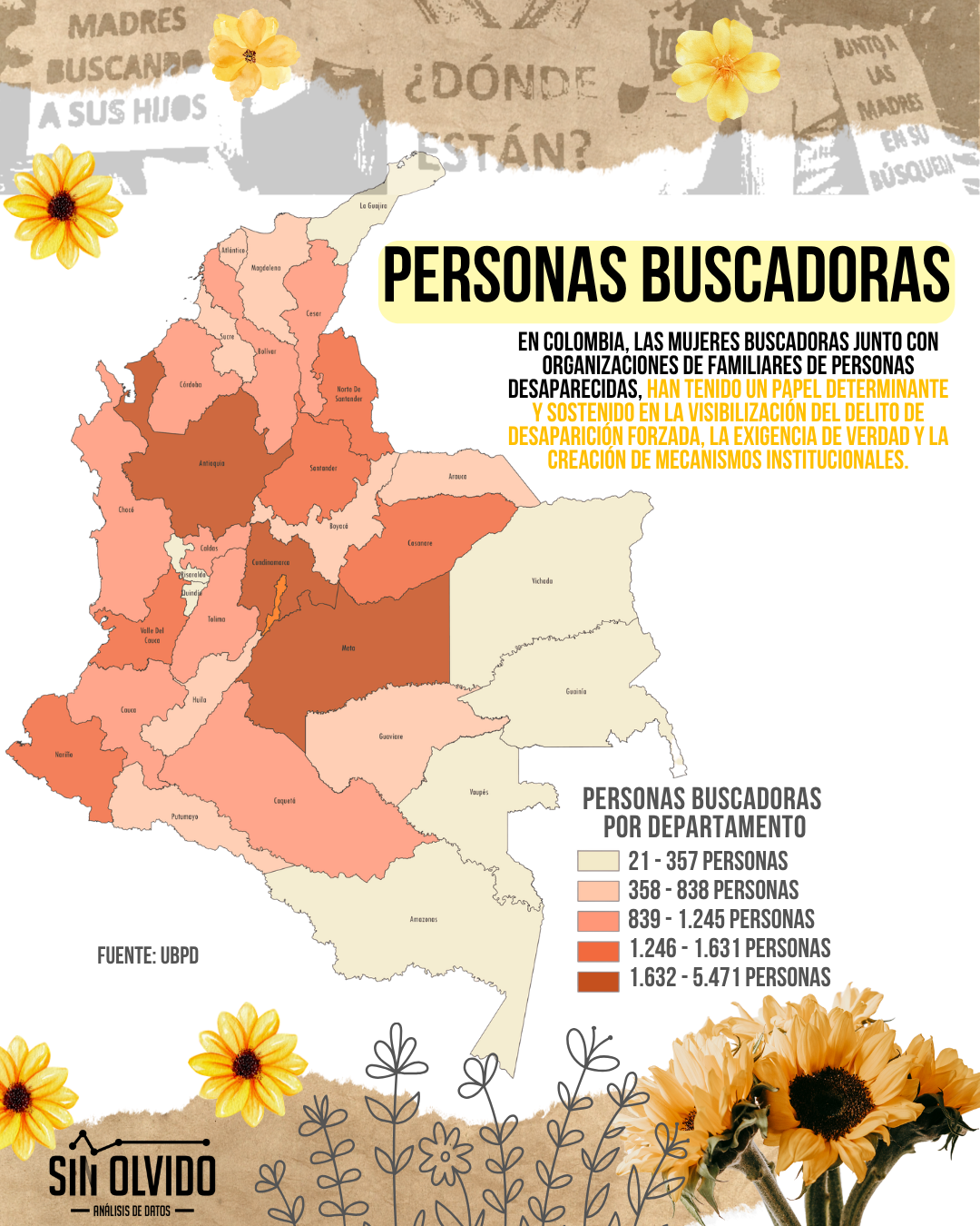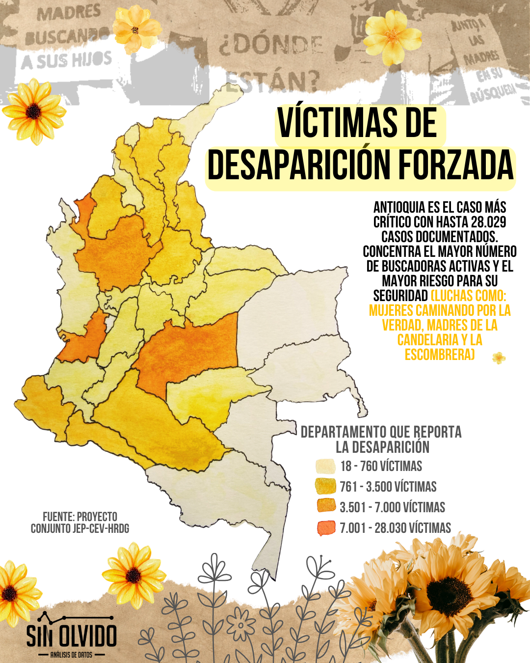 A nivel departamental, Antioquia emerge como el caso más crítico con este crímen. Este departamento concentra el mayor número de casos documentados, con hasta 28.029 víctimas. No es casualidad, entonces, que también sea el territorio donde más se ha tejido la resistencia femenina: allí operan colectivos emblemáticos como Mujeres Caminando por la Verdad, Madres de la Candelaria, quienes han enfrentado un riesgo extremo por su labor.