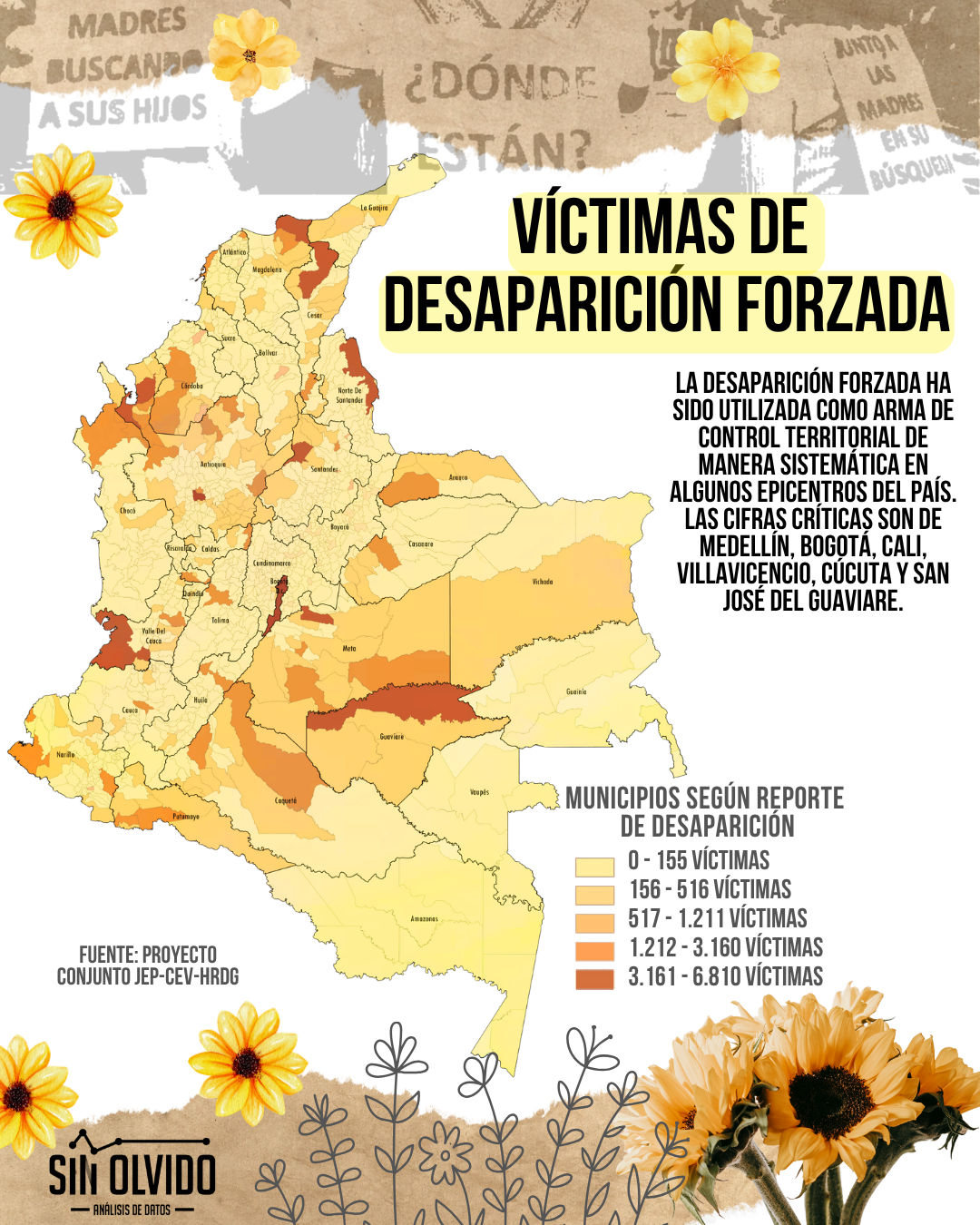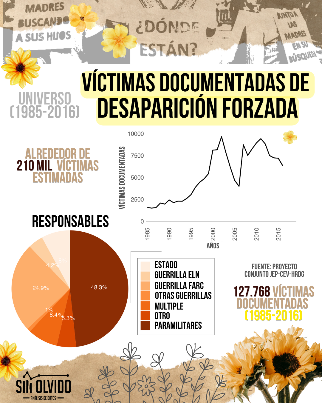 De acuerdo con el proyecto conjunto de la Jurisdicción Especial para la Paz (JEP), la Comisión para el Esclarecimiento de la Verdad (CEV) y el Centro de Memoria Histórica, se han documentado 127.768 víctimas de desaparición forzada entre 1985 y 2016. No obstante, esta cifra representa solo la punta del iceberg. Las estimaciones más realistas, basadas en modelamientos estadísticos y testimonios, señalan que el número real de víctimas se acerca a 210 mil personas.